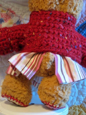 As I promised in my last post....I finally finished my sweet little Beary Goodness!!! This is little Lulu, she loves all things yummy! She comes with her very own red crochet sweater, a very cute striped skirt in pinks and browns and has been hand embroidered with a cupcake, hot coco, and strawberry's!!!